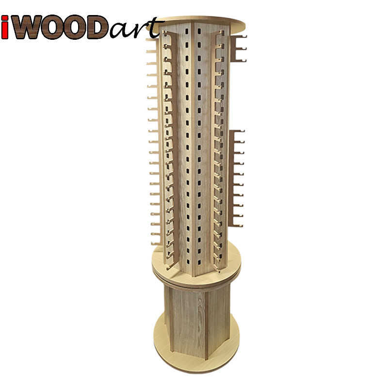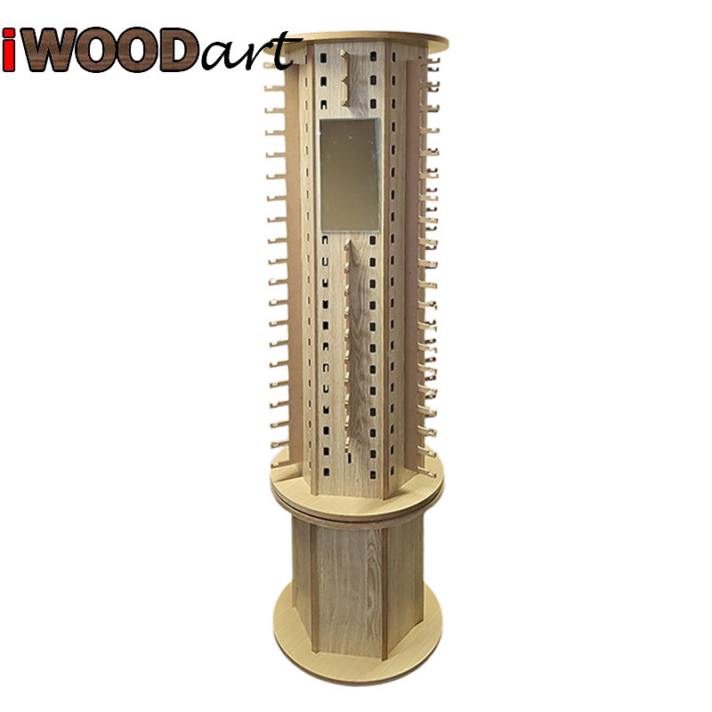 Περιστρεφόμενο εξάγωνο στάντ προβολής γυαλιών ηλίου 115 θέσεων για καταστήματα οπτικών. Κατασκευασμένο από μελαμίνη σε απόχρωση “Δρύ” με MDF και αλουμίνιο. Το στάντ είναι συναρμολογημένο έτοιμο για χρήση.